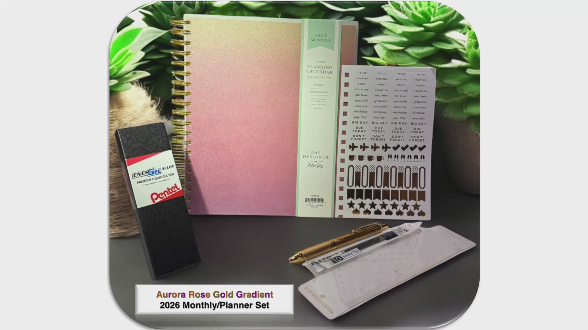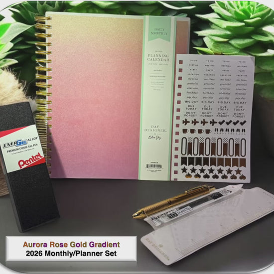 The 2026 Monthly Planner Set is accompanied by the matching Pentel EnerGel Gold Alloy Retractable Pen that brings a touch of sophistication to your workspace. The front and back cover is an Aurora Rose Gold Gradient Glitter cardstock with shimmering colors of champagne gold, rose cooper, and deep berry/raspberry finish. This sleek artistic finish transforms the planner into not just a functional tool but also a stylish accessory. A true blend of craftsmanship and creativity.
