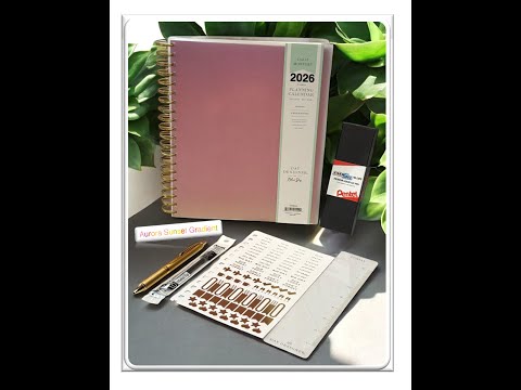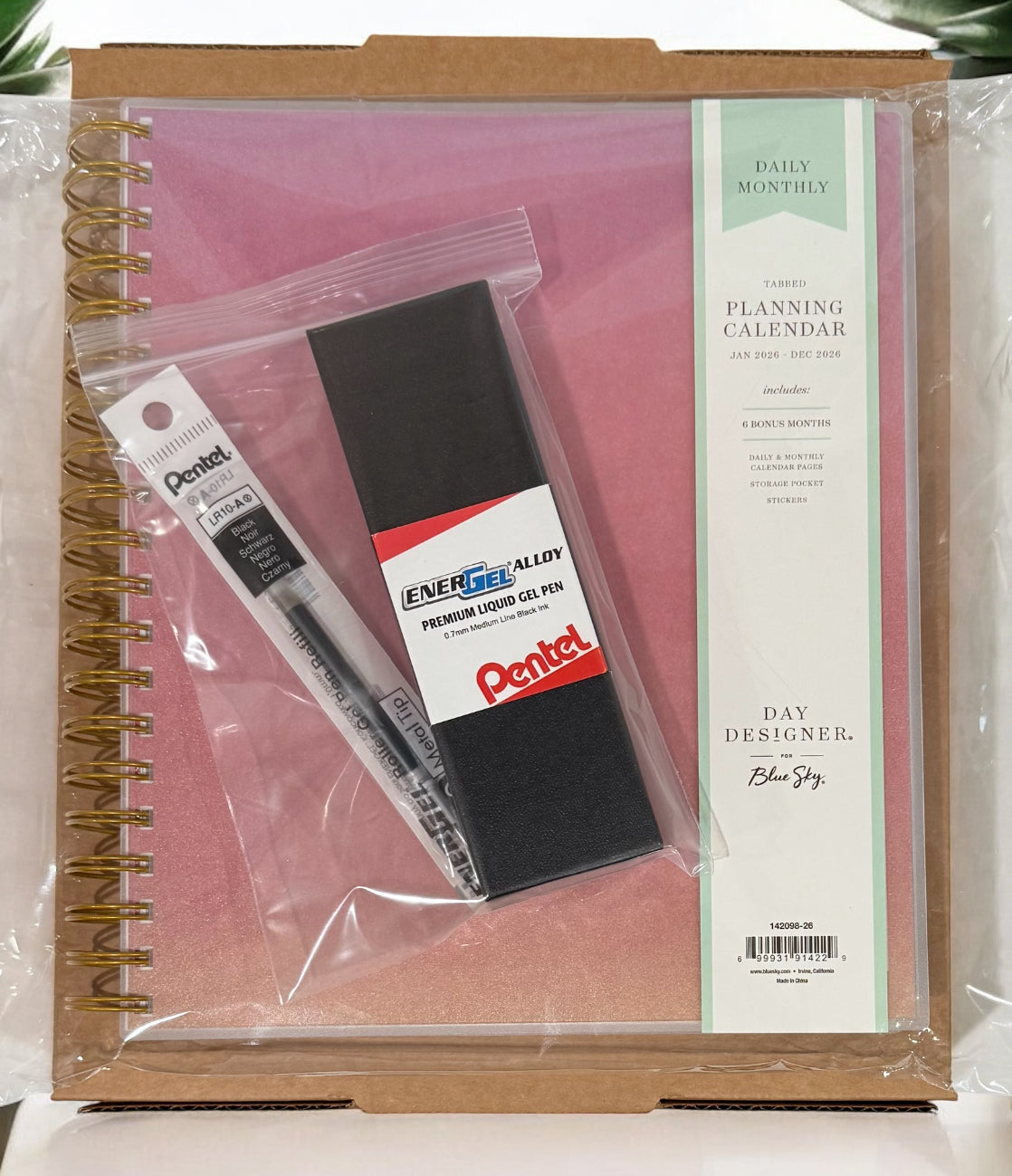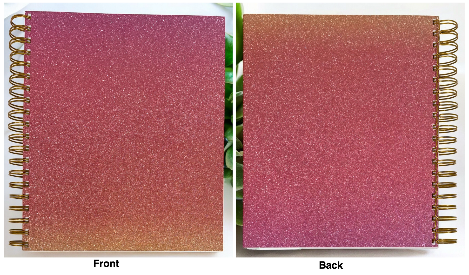 The 2026 Monthly Planner Set is accompanied by the matching Pentel EnerGel Gold Alloy Retractable Pen that brings a touch of sophistication to your workspace. The front and back cover is an Aurora Sunset Gradient glitter cardstock with shimmering effects of Rose-Magenta, Coral-Peach, and Light Amber finish. This sleek artistic finish transforms the planner into not just a functional tool but also a stylish accessory. A true blend of craftsmanship and creativity.