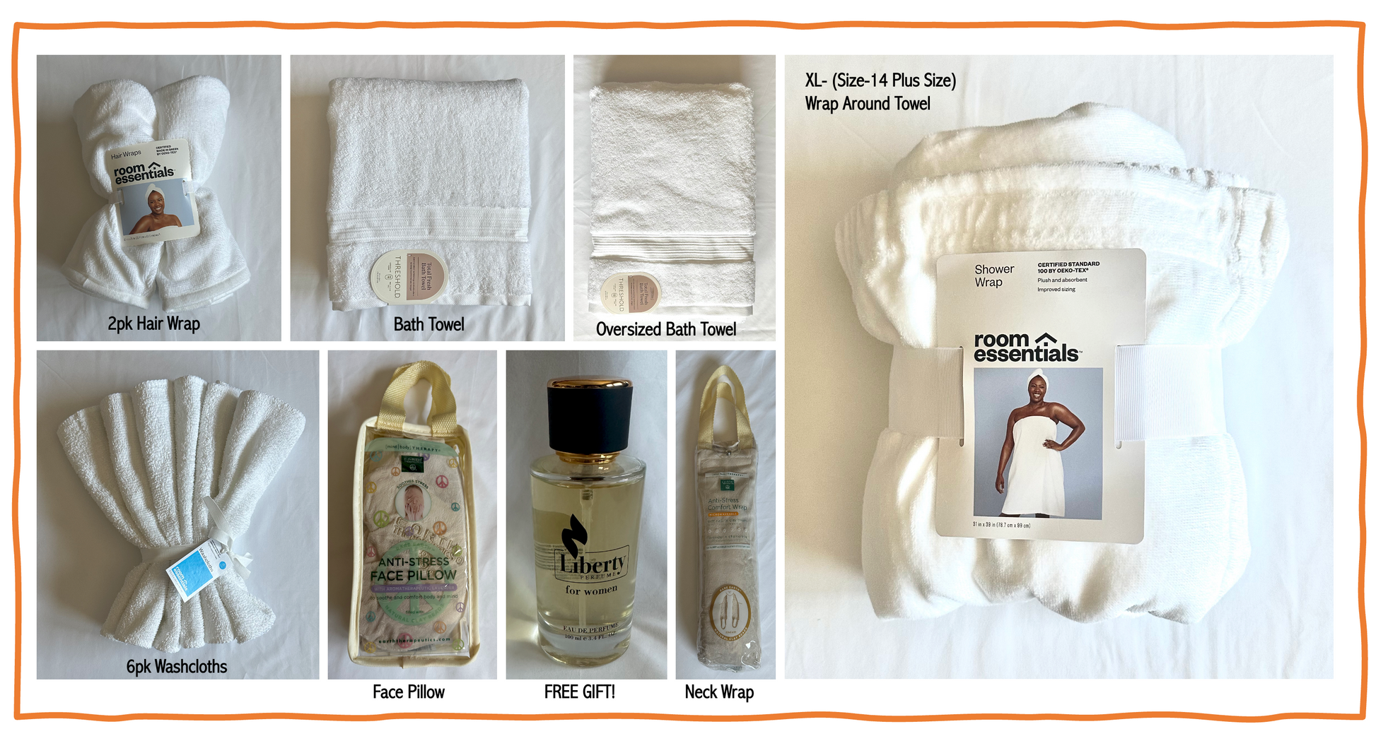 Wherever you’re going away from home, take this spa collection set with you when you need to unwind and relax after a long trip. This 14 piece-set that includes an oversized bath towel, a bath towel, a wrap around towel, 2 headwrap towels, comfort neck wrap to relieve muscle tension, eye pillow to soothe your face muscles, 6 washcloths and a free gift Liberty Perfume-Good Girl Scent.