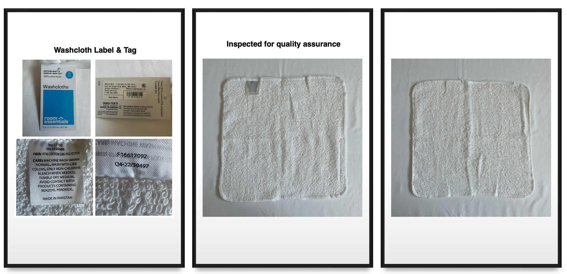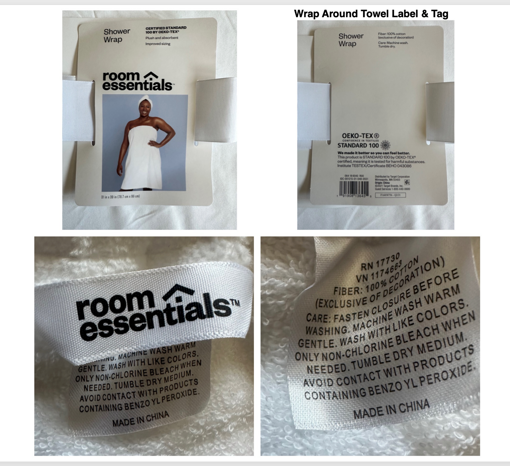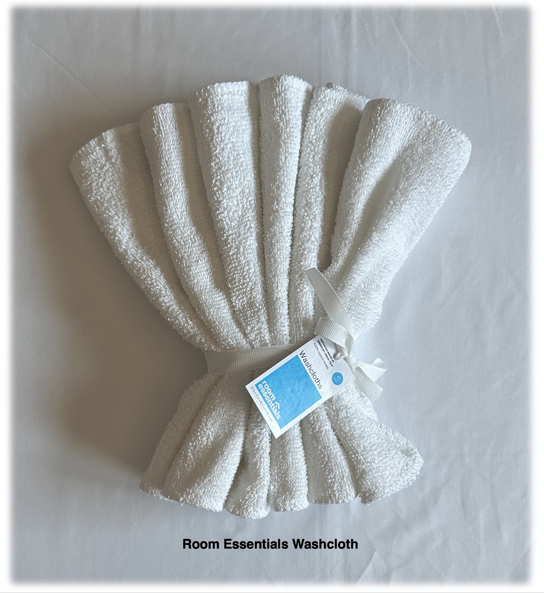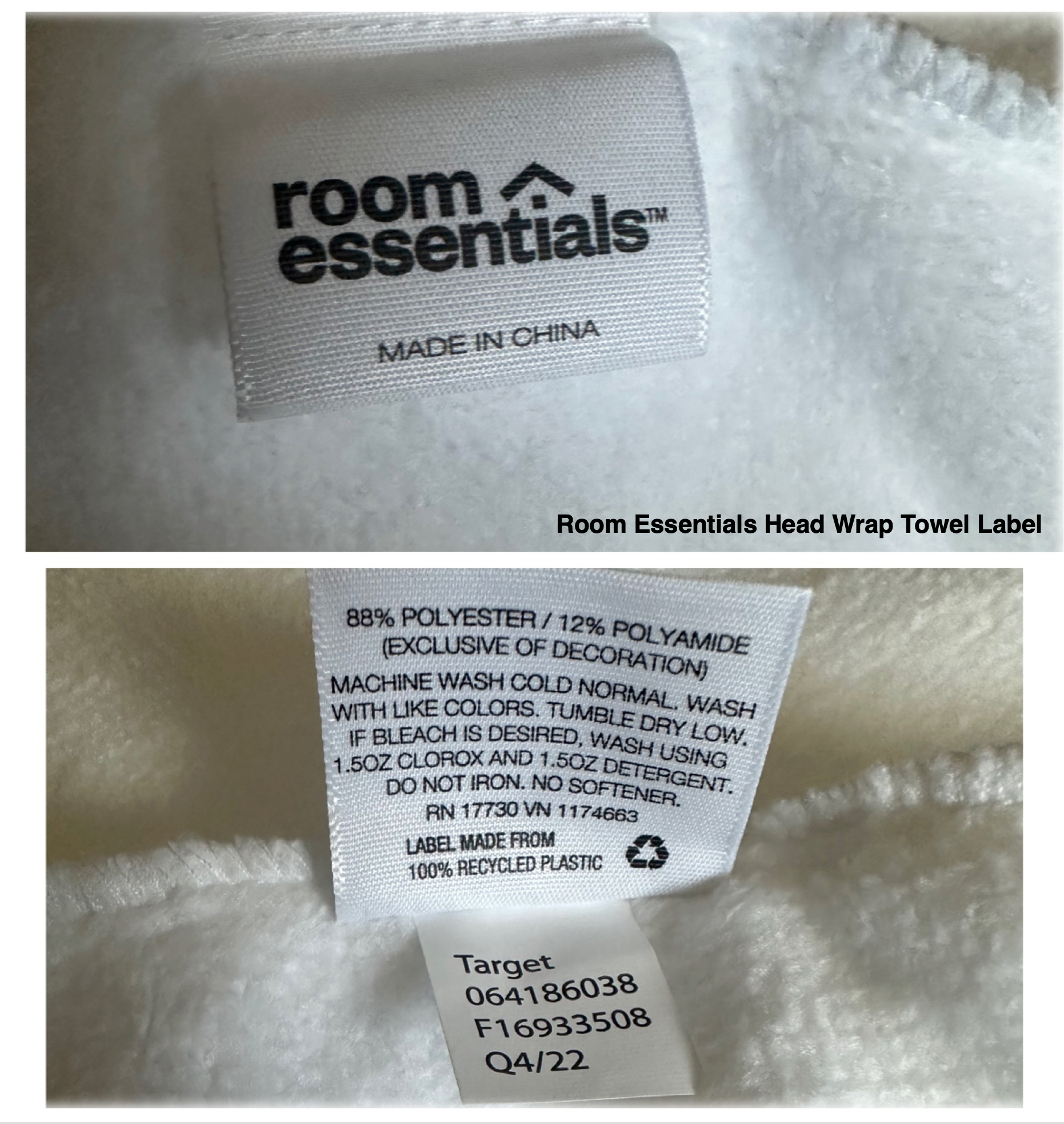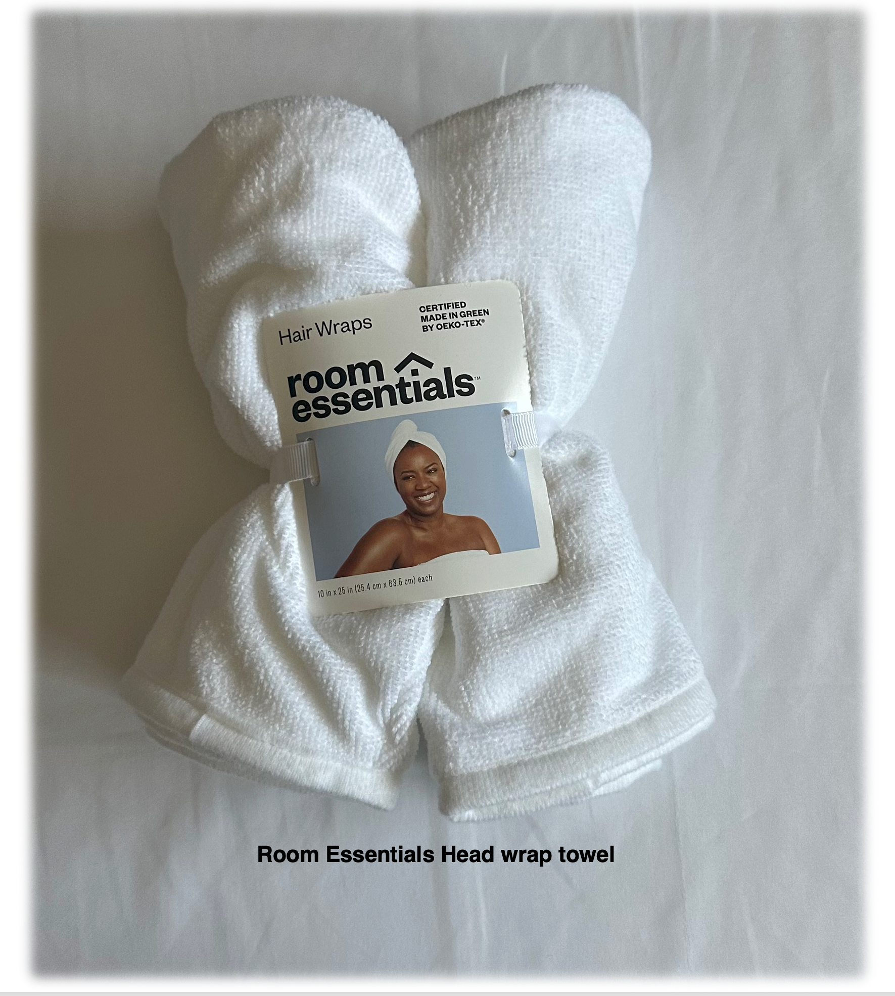 Room Essentials Hair Wrap 2-pk Size: 10 inches x 25 inches | Color: White | Material 88% Polyester/12%Plyamide | $10.00 Room Essential Washcloths 6-pk Color: White | Material: 100% Cotton | $3.50