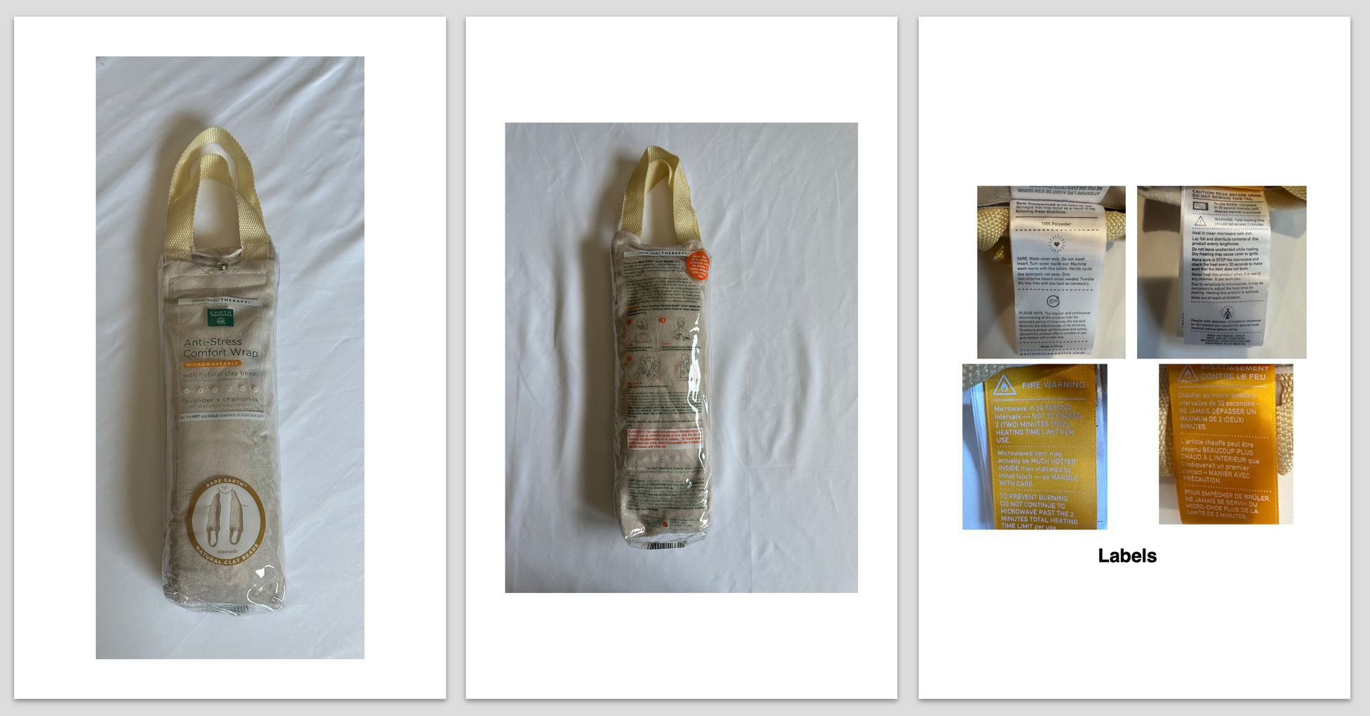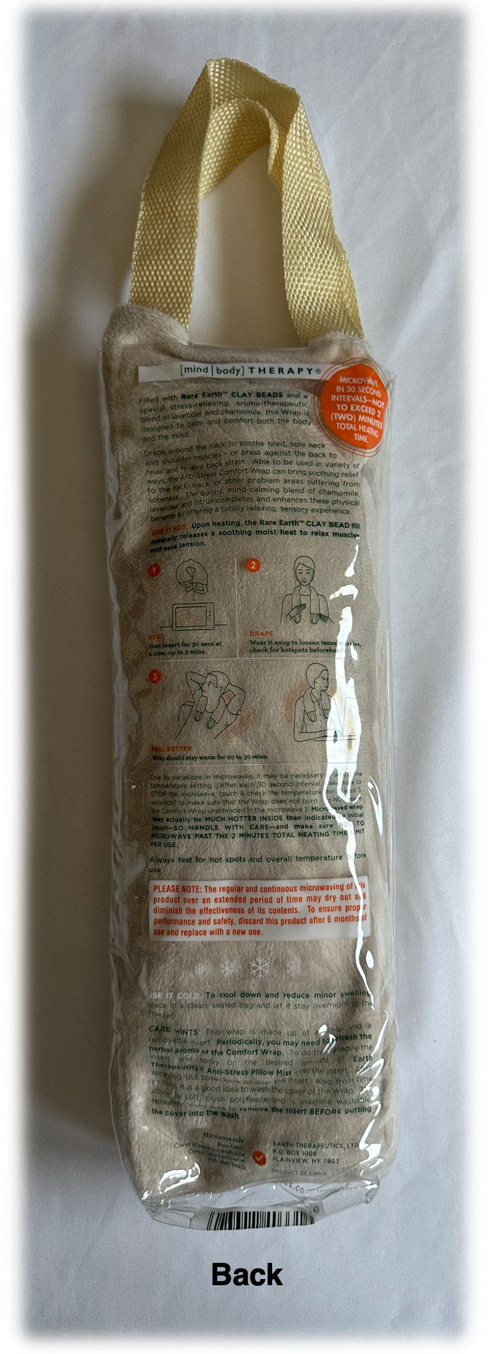 Note: You can microwave the wrap on a clean turntable for 15 seconds to 30 seconds at a time, no more than 60 seconds. Never place it for 60 seconds on 1000 watts. The clay beads will diminish its effectiveness. Let me share my tips on this awesome product. I use a shoe tie on both ends to wrap around my hips when back aches. It helps warm and soothe my back and helps with constipation, especially in the winter. I can walk and do household tasks with comfort. I included a brand-new shoe tie as well.