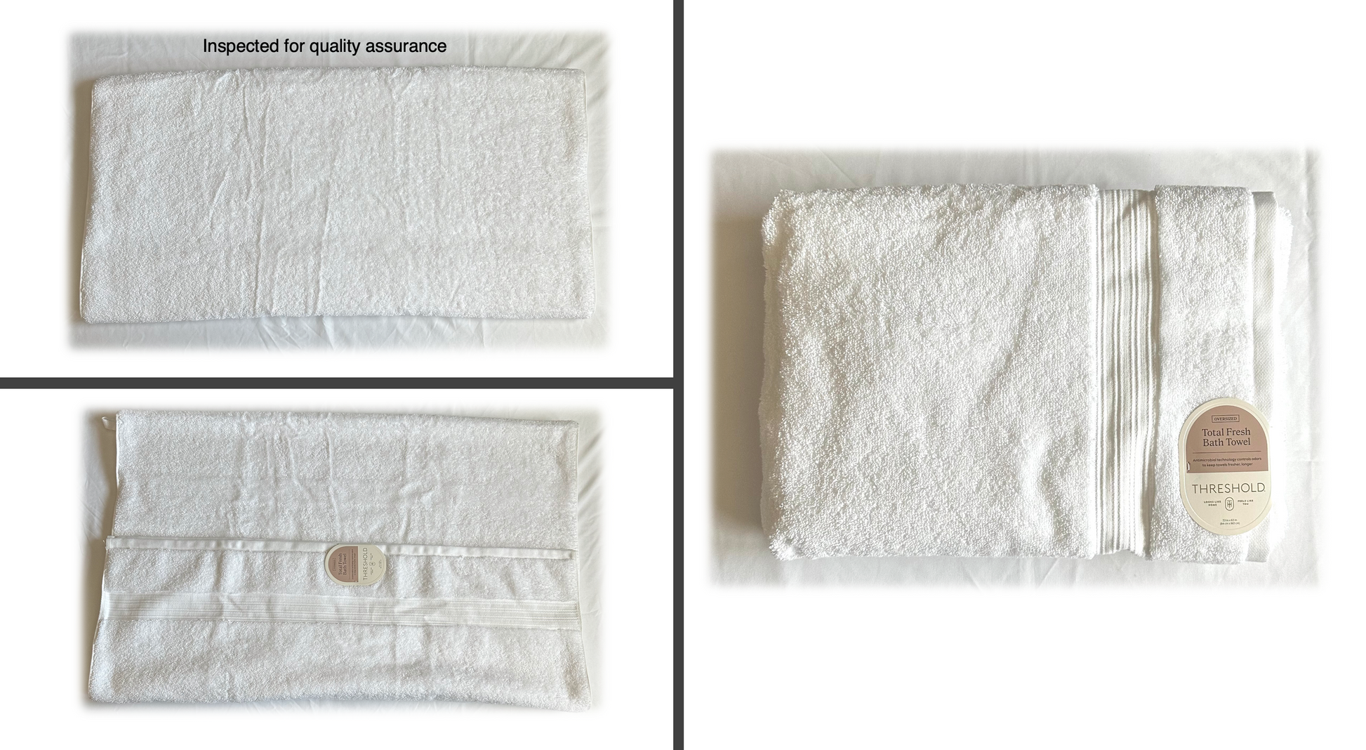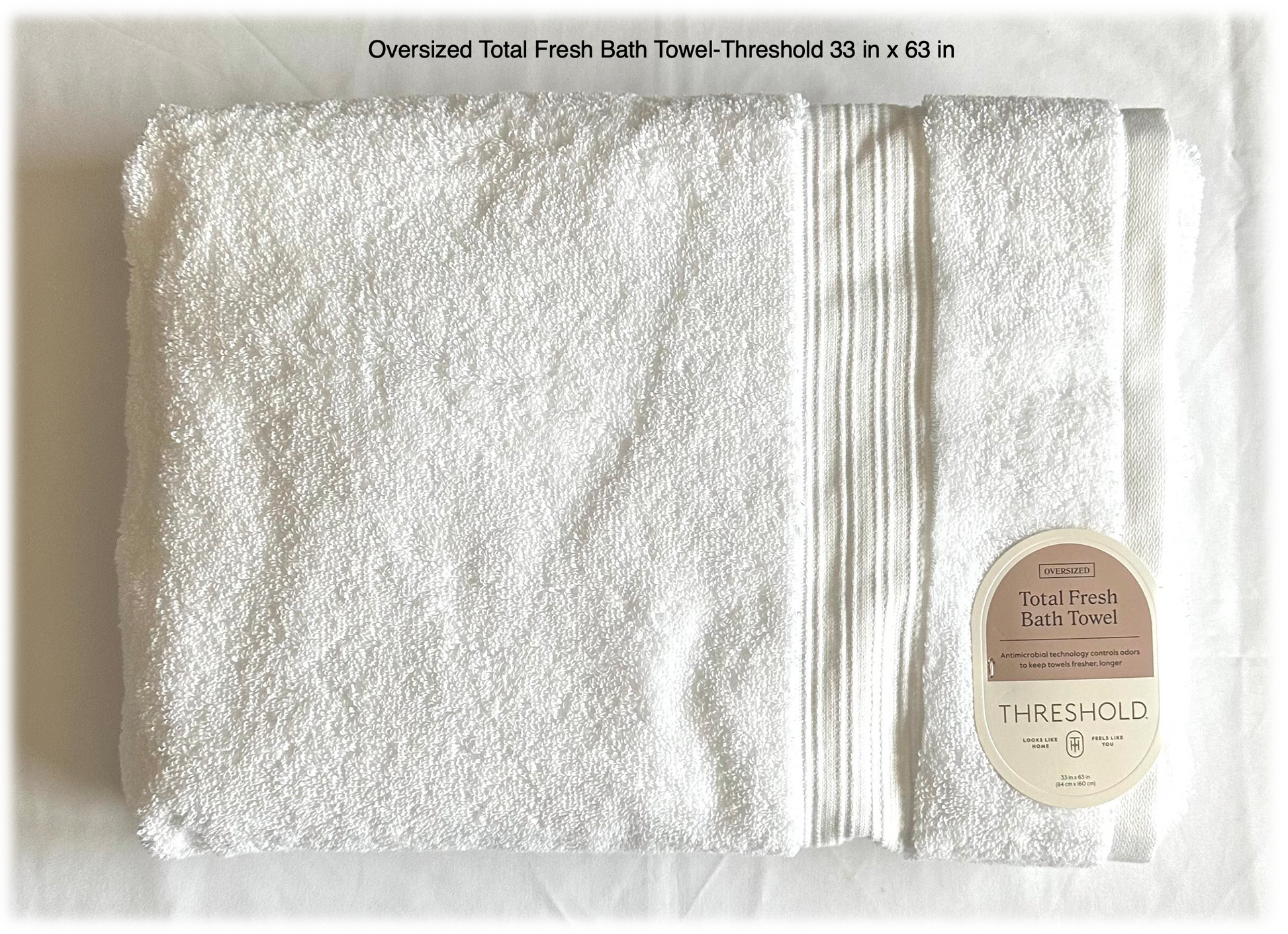 Oversized Total Fresh Bath Towel-Threshold Size: 33 inches x 63 inches | Color: White | Material: 100% Cotton | Wash before Using| Machine wash warm with like colors. Use only non-chlorine bleach when needed. Tumble dry medium setting || $12.00
