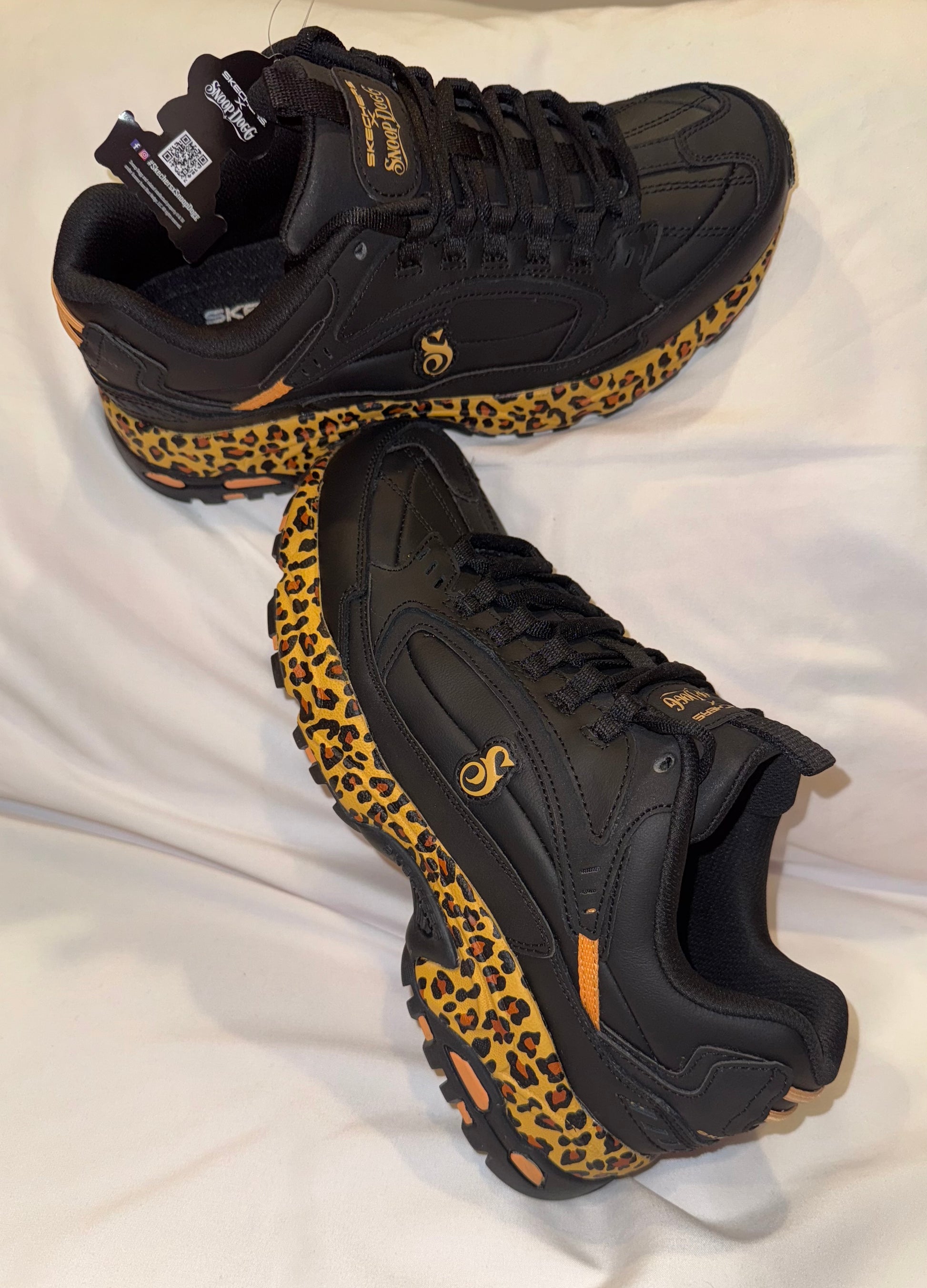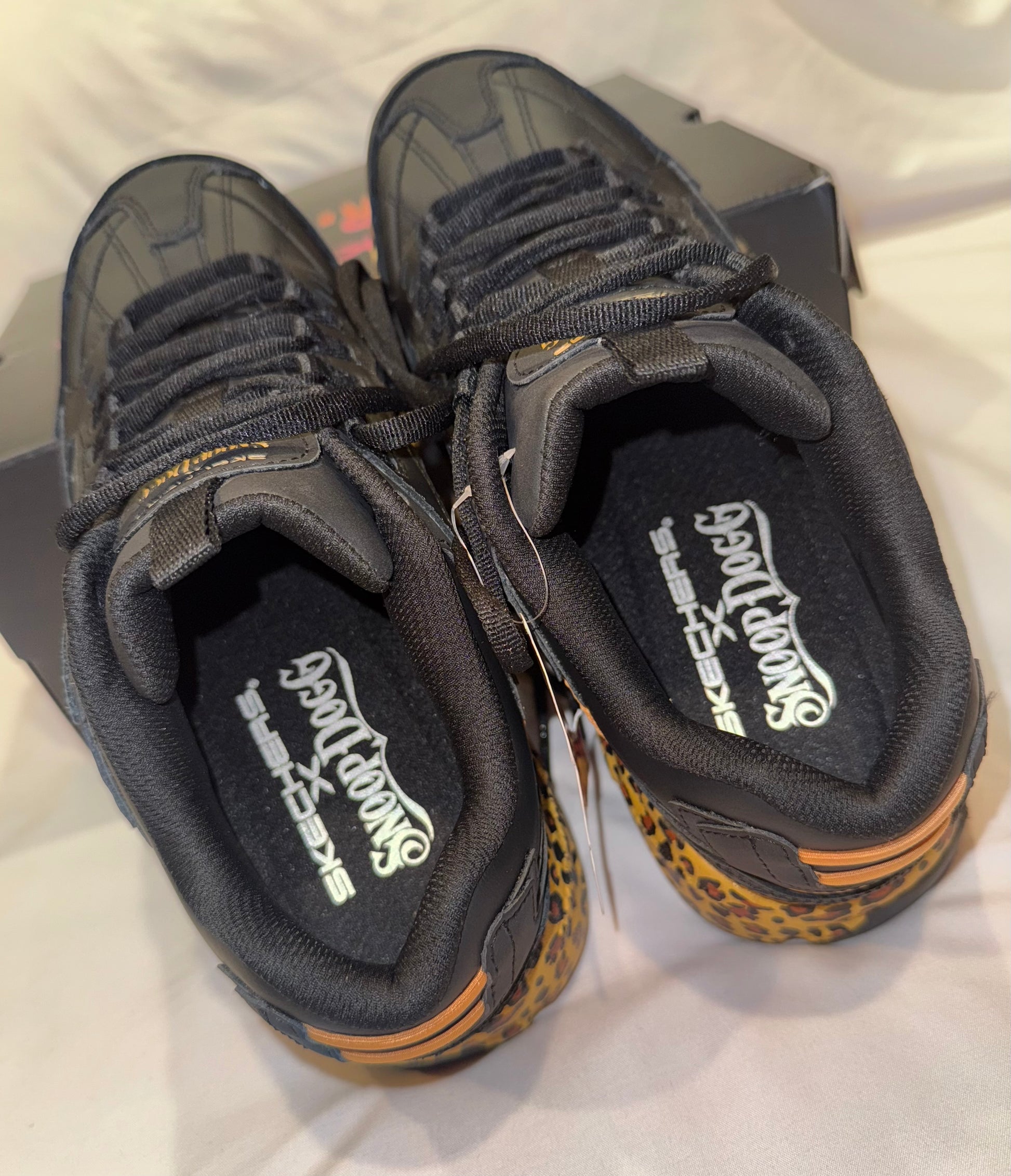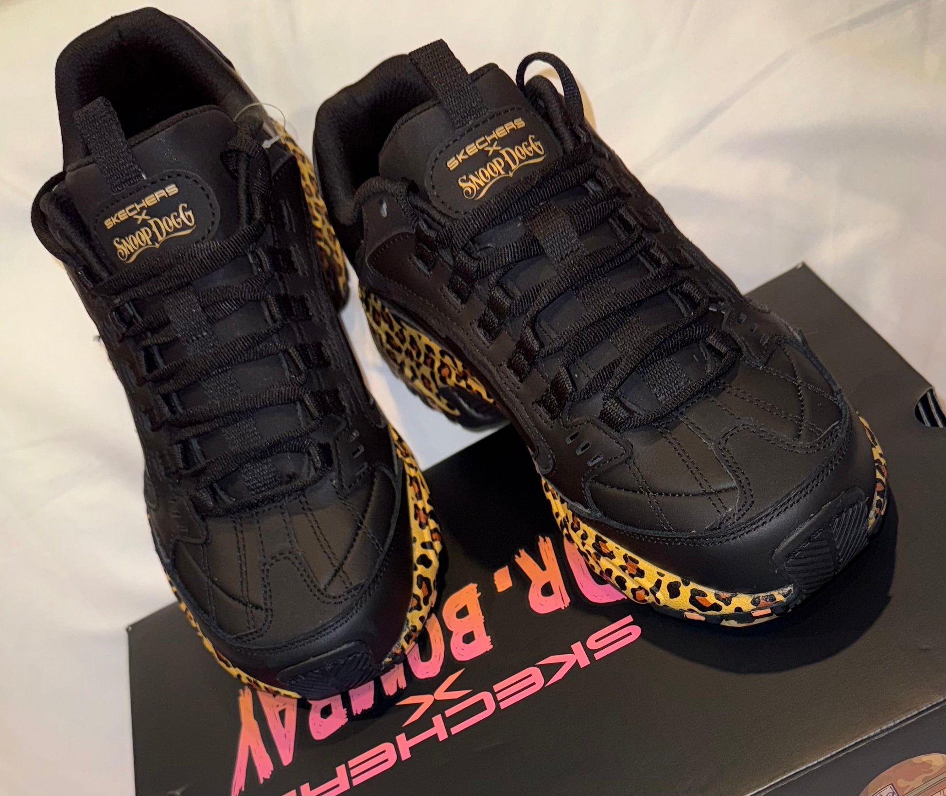 Design Highlights: Premium smooth leather upper with stitching accents | Eye-catching Dr. Bombay-inspired leopard print midsole | Dual laces included to customize your look | Dura-Grip rugged rubber outsole for maximum traction | 1 ¾” heel height for extra lift | Skechers® + Snoop Dogg logo detailing throughout