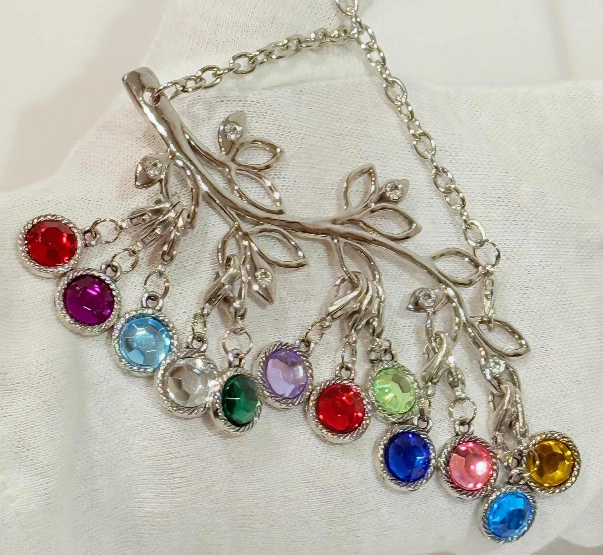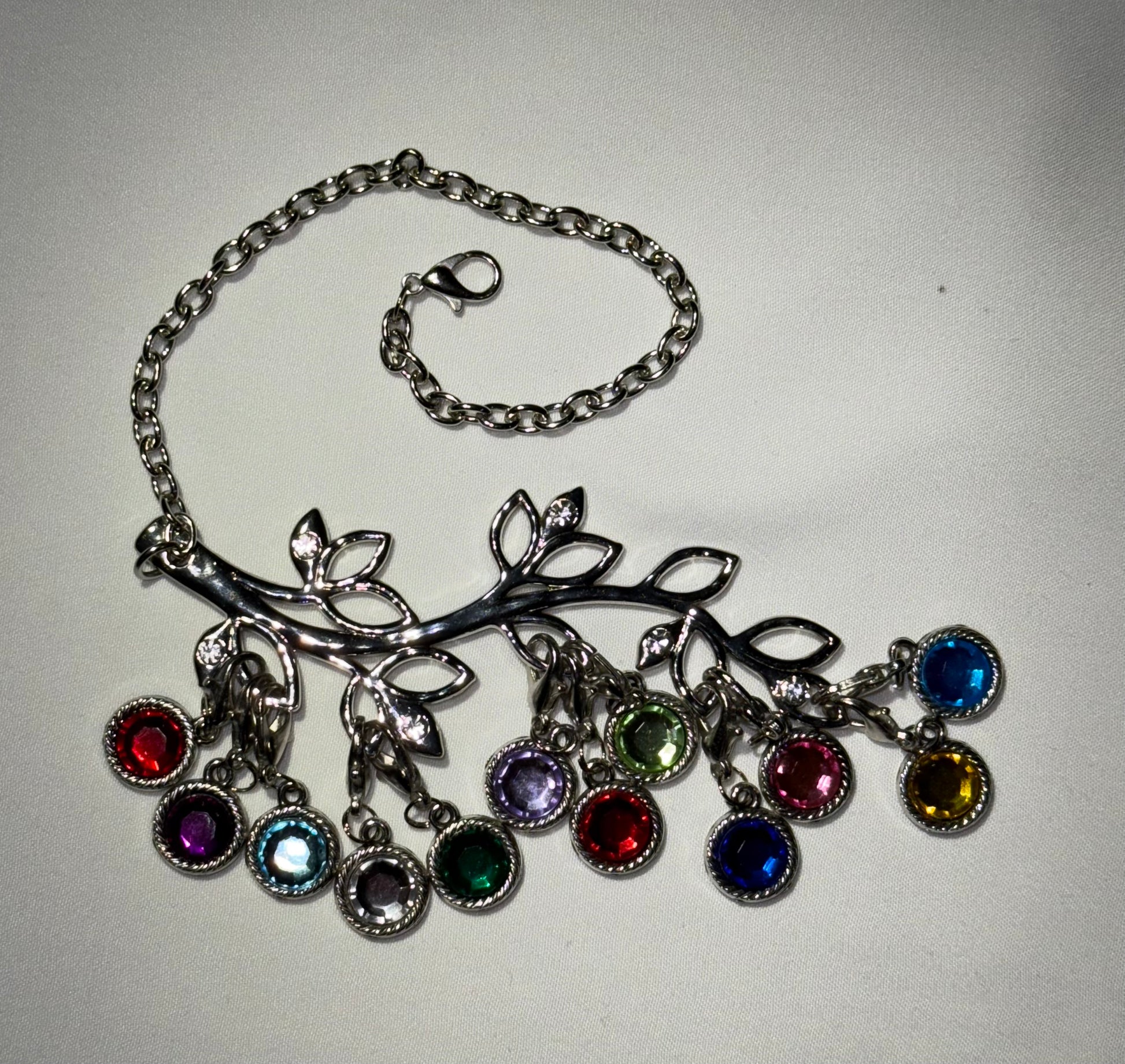 Crafted from polished silver-toned metal, the intricate branch design holds delicate charms representing January through December. Each birthstone charm glimmers with color and detail, suspended securely for a timeless and meaningful display.