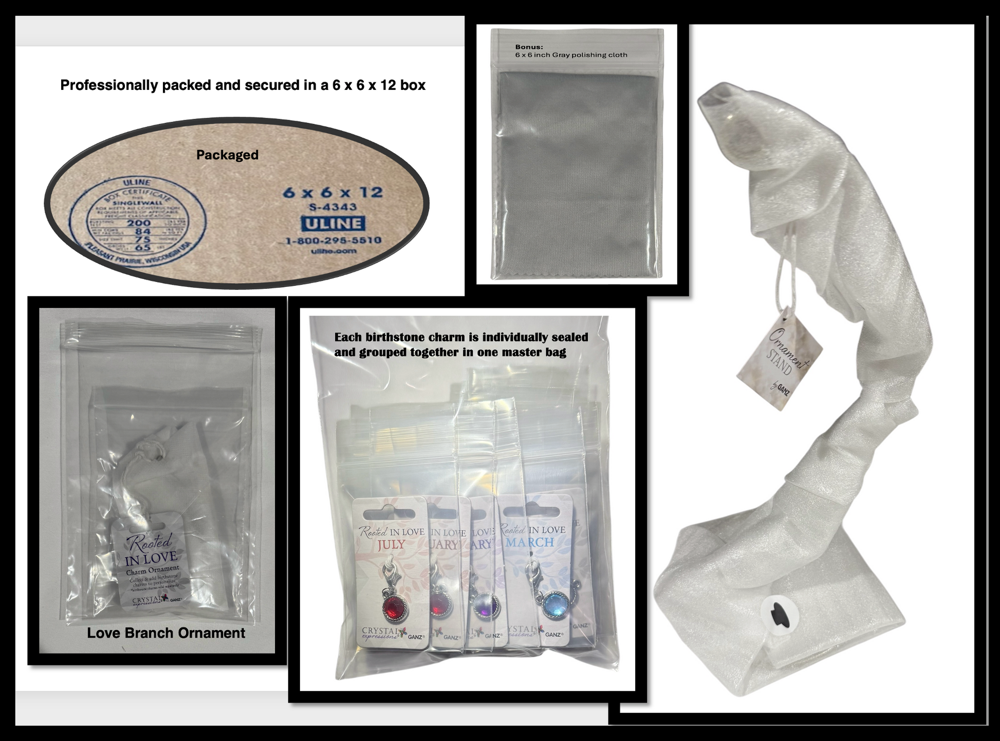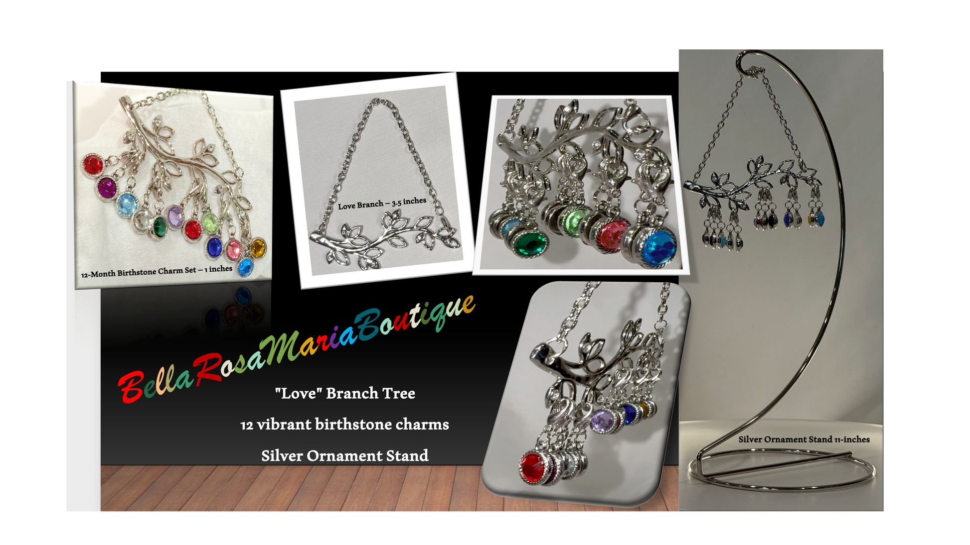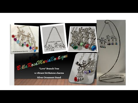 Title: Silver Ornament Stand and Love Branch and 12-Month Birthstone Charm Set